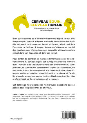 Bien que l’homme et le cheval collaborent depuis la nuit des temps un peu partout à travers le monde, l’éducation des équidés est avant tout basée sur l’essai et l’erreur, allant parfois à l’encontre de l’animal. Si le sport équestre s’intéresse au mental des cavaliers, peu d’importance est accordée à l’émotionnel du cheval dans son éducation et dans son travail. Pour tenter de combler ce manque d’informations sur le fonctionnement du cerveau équin, cet ouvrage explique la manière dont l’humain et le cheval perçoivent leur environnement, comprennent, se concentrent et ressentent la peur ou la confiance, en particulier lorsqu’ils interagissent. Ceci sert un double objectif : gagner un temps précieux dans l’éducation du cheval et l’amélioration de ses performances, tout en développant un lien plus profond, basé sur la connaissance et le respect. Cet éclairage neuf aborde les nombreuses questions que se posent tous les passionnés de chevaux. Janet L. Jones est titulaire d’une thèse en sciences cognitives, obtenue à l’Université de Californie de Los Angeles (UCLA), portant sur la capacité du cerveau humain à résoudre les ambiguïtés de langage. Cerveau équin, cerveau humain est son quatrième livre.