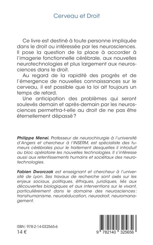 Ce livre est destiné à toute personne impliquée dans le droit ou intéressée par les neurosciences. Il pose la question de la place à accorder à l'imagerie fonctionnelle cérébrale, aux nouvelles neurotechnologies et plus largement aux neurosciences dans le droit. Au regard de la rapidité des progrès et de l'émergence de nouvelles connaissances sur le cerveau, il est possible que la loi ait toujours un temps de retard. Une anticipation des problèmes qui seront soulevés demain et après-demain par les neurosciences permettra-t-elle au droit de ne pas être éternellement dépassé ?