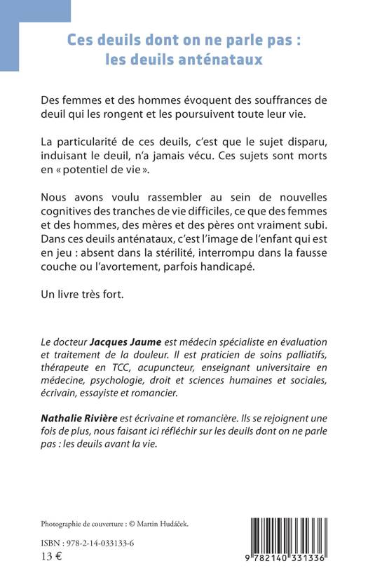 Des femmes et des hommes évoquent des souffrances de deuil qui les rongent et les poursuivent toute leur vie. La particularité de ces deuils, c'est que le sujet disparu, induisant le deuil, n'a jamais vécu. Ces sujets sont morts en « potentiel de vie ». Nous avons voulu rassembler au sein de nouvelles cognitives des tranches de vie difficiles, ce que des femmes et des hommes, des mères et des pères ont vraiment subi. Dans ces deuils anténataux, c'est l'image de l'enfant qui est en jeu : absent dans la stérilité, interrompu dans la fausse couche ou l'avortement, parfois handicapé. Un livre très fort.