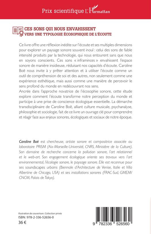 Ce livre offre une réflexion inédite sur l'écoute et ses multiples dimensions pour explorer un paysage sonore souvent inouï celui des sons de faible intensité produits par la technologie, qui nous entourent sans que nous en soyons conscients. Ces sons inframinces envahissent l'espace sonore de manière insidieuse, réduisant nos capacités d'écoute. Caroline Boë nous invite à y prêter attention et à utiliser l'écoute comme un outil de compréhension de soi et des autres, non seulement comme une expérience esthétique, mais aussi comme une manière de percevoir le sens profond du monde en redécouvrant nos sens. Ancrée dans l'approche novatrice de l'écosophie sonore, cette étude explore comment l'écoute transforme notre perception du monde et participe à une prise de conscience écologique essentielle. La démarche transdisciplinaire de Caroline Boë, alliant culture musicale, psychanalyse, philosophie et sociologie, fait de ce livre un ouvrage clé pour comprendre et réagir face aux enjeux sonores, écologiques et sociaux de notre époque.