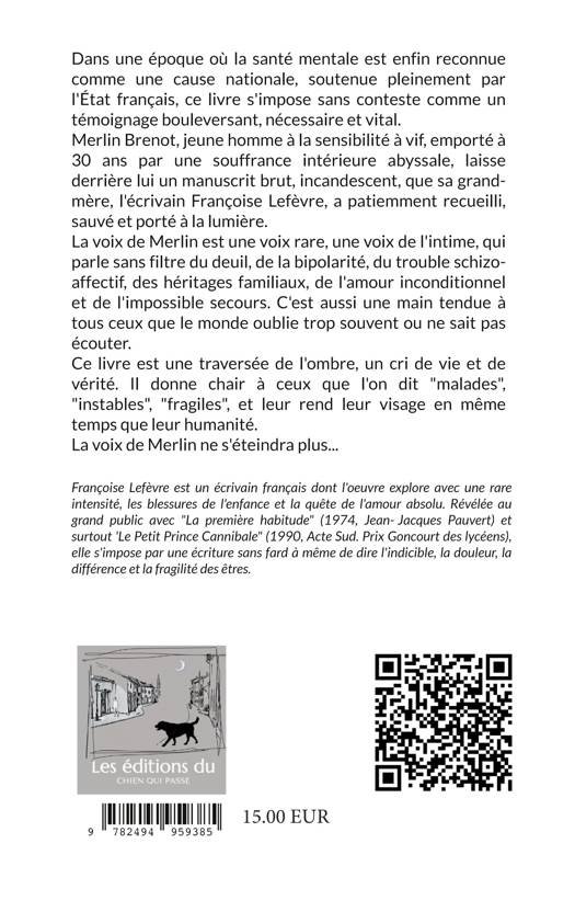Merlin Brenot, jeune homme à la sensibilité à vif, emporté à 30 ans par une souffrance intérieure abyssale, laisse derrière lui un manuscrit brut, incandescent, que sa grand-mere, l'écrivain Françoise Lefèvre, a patiemment recueilli, sauvé et porté à la lumière.
