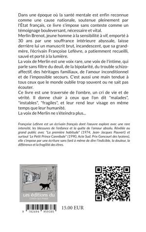La voix de Merlin est une voix rare, une voix de l'intime, qui parle sans filtre du deuil, de la bipolarité, du trouble schizo-affectif, des héritages familiaux, de l'amour inconditionnel et de l'impossible secours. C'est aussi une main tendue à tous ceux que le monde oublie trop souvent ou ne sait pas écouter.