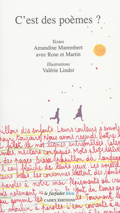 Les paroles des enfants sont souvent d’une poésie brute magnifique. Qui n’a pas un jour noté ces mots si frais et inédits qu’ils s’échappent immédiatement de nos oreilles et de nos bouches de grands ? Il s’agit ici d’un tissage de paroles de Martin - fils de l’illustratrice - et de Rose - fille de l’auteure -, recueillies et notées telles des trésors, par les mères. Amandine Marembert les a organisées pour construire ce texte, Valérie Linder en propose des images colorées et joyeuses. Publié dans la collection poésie du « Farfadet bleu » ; couverture illustrée recto/verso, nombreuses illustrations couleur à l’intérieur.