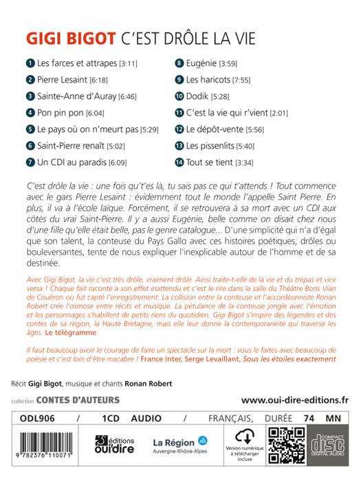 C'est drôle la vie : une fois qu't'es là, tu sais pas ce qui t'attend ! Tout commence avec le gars Pierre Lesaint : évidemment tout le monde l'appelle Saint Pierre. En plus, il va à l'école laïque. Forcément, à sa mort, il se retrouvera avec un CDI aux côtés du vrai Saint-Pierre. Il y a aussi Eugénie, belle comme on disait chez nous d'une fille qu'elle était belle, pas le genre catalogue... D'une simplicité qui n'a d'égal que son talent, la conteuse du Pays Gallo avec ces histoires poétiques, drôles ou bouleversantes, tente de nous expliquer l'inexplicable autour de l'homme et de sa destinée.
