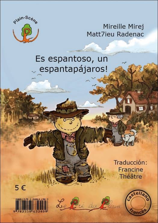 Dans la collection Plain-Scène : des histoires mises en scène, en contes, en musique... pour le plaisir de lire, entendre et voir - C'est épouvantable, un épouvantail ! est un texte qui s’enracine dans une culture et dans la Nature. Il paraît en version bilingue français/castillan. "Au printemps, Gustave avait fabriqué un épouvantail avec sa vieille salopette, son ancien chapeau, ses souliers troués, sa veste rapiécée. Il l’avait appelé Gus. Gus était planté dans le jardin pour faire croire aux animaux de passage que Gustave protégeait jour et nuit ses fruits et ses légumes…" "En primavera, Gustavo había construido un espantapájaros con su viejo peto, su viejo sombrero, sus zapatos agujereados, su chaqueta remendada. Lo llamó Gus. Gus estaba plantado en el jardín para hacer creer a los animales que pasaban, que Gustavo protegía sus frutas y verduras día y noche ..."