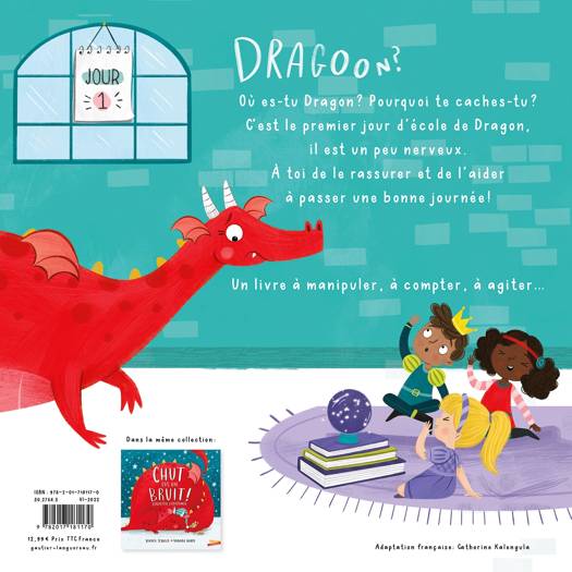 Dragon ? Où es-tu Dragon ? Vite, tu vas être en retard pour ton premier jour d'école ! Dragon est un peu inquiet, il ne veut pas y aller. Accompagné de ses nouveaux amis, il va prendre petit à petit confiance en lui. Il y aura quelques maladresses et accidents, mais c'est comme cela qu'on apprend. Un nouveau livre interactif ! Toi aussi accompagne Dragon à l'école : compte, chante, lève les mains, hoche la tête et sois prêt pour la rentrée.