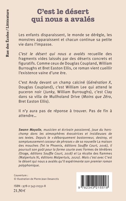 Les enfants disparaissent, le monde se dérègle, les monstres apparaissent et chacun continue sa petite vie dans l'impasse. C'est le désert qui nous a avalés recueille des fragments vides laissés par des déserts concrets et figuratifs. Comme ceux de Douglas Coupland, William Burroughs et Bret Easton Ellis, ce roman vient cueillir l'existence vaine d'une ère.