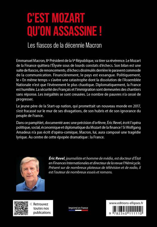 Dans ce pamphlet, documenté avec une précision d’orfèvre, Éric Revel , chapitre après chapitre, en reprenant les grandes pièces musicales de Wolfgang Amadeus Mozart, écrit l’opéra politique, social, économique et diplomatique du « Mozart de la finance » ! « Wolfie » n'a pas écrit d’« opéra-comique ». Macron, lui, aura composé une « tragédie lyrique ». Au centre de cette épopée dramatique : la France.