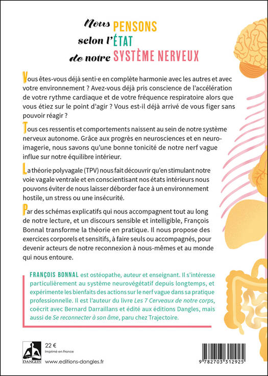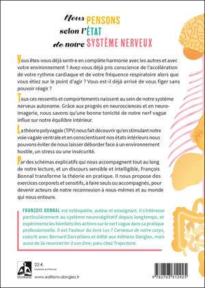 Vous êtes-vous déjà senti·e en complète harmonie avec les autres et avec votre environnement ? Avez-vous déjà pris conscience de l’accélération de votre rythme cardiaque et de votre fréquence respiratoire alors que vous étiez sur le point d’agir ? Vous est-il déjà arrivé de vous figer sans pouvoir réagir ? Tous ces ressentis et comportements naissent au sein de notre système nerveux autonome. Grâce aux progrès en neurosciences et en neuro-imagerie, nous savons qu’une bonne tonicité de notre nerf vague influe sur notre équilibre intérieur. La théorie polyvagale (TPV) nous fait découvrir qu’en stimulant notre voie vagale ventrale et en conscientisant nos états intérieurs nous pouvons éviter de nous laisser déborder face à un environnement hostile, un stress ou une insécurité. Par des schémas explicatifs qui nous accompagnent tout au long de notre lecture, et un discours sensible et intelligible, François Bonnal transforme la théorie en pratique. Il nous propose des exercices corporels et sensitifs, à faire seuls ou accompagnés, pour devenir acteurs de notre reconnexion à nous-mêmes et au monde qui nous entoure.