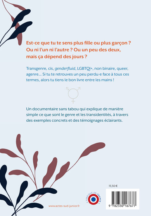 Est-ce que je me sens plus fille ou plus garçon ? Ou ni l'un ni l'autre ? Ou un peu des deux, mais ça dépend des jours ? Un livre pour ceux qui s'interrogent, sur eux-mêmes ou sur des personnes de leur entourage. Des interrogations souvent déstabilisantes, qui entrent parfois en résonance avec un certain mal-être, mais ouvrent aussi la voie à une vie en accord avec soi-même. Définir les mots, les situations dans toute leur diversité, lire des témoignages et comprendre les processus de transition, tel est le propos de ce livre destiné aux adolescents et à leurs parents !