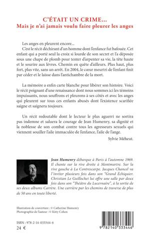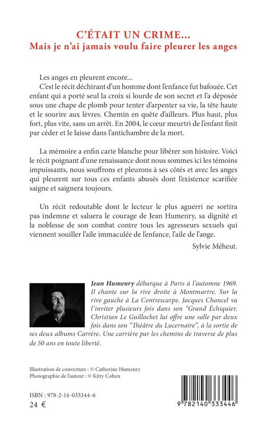 Les anges en pleurent encore... C'est le récit déchirant d'un homme dont l'enfance fut bafouée. Cet enfant qui a porté seul la croix si lourde de son secret et l'a déposée sous une chape de plomb pour tenter d'arpenter sa vie, la tête haute et le sourire aux lèvres. Chemin en quête d'ailleurs. Plus haut, plus fort, plus vite, sans un arrêt. En 2004, le cur meurtri de l'enfant finit par céder et le laisse dans l'antichambre de la mort. La mémoire a enfin carte blanche pour libérer son histoire. Voici le récit poignant d'une renaissance dont nous sommes ici les témoins impuissants, nous souffrons et pleurons à ses côtés et avec les anges qui pleurent sur tous ces enfants abusés dont l'existence scarifiée saigne et saignera toujours. Un récit redoutable dont le lecteur le plus aguerri ne sortira pas indemne et saluera le courage de Jean Humenry, sa dignité et la noblesse de son combat contre tous les agresseurs sexuels qui viennent souiller l'aile immaculée de l'enfance, l'aile de l'ange. Sylvie Méheut.
