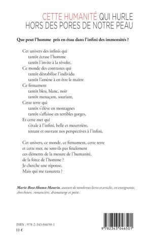 Il s'agit d'un recueil de poème écrit par une femme d'origine camerounaise, chercheuse de renommée, ancienne enseignante de langue française et professeure de littérature française et francophones en France, en Afrique, et au Brésil. Les vers de Marie-Rose Abomo-Maurin sont porteurs de passion et veulent destabiliser les croyances enracinées qui font accepter un certain fatalisme, selon lequel les sociétés seraient immuables ou impossibles à transformer. Avec ce titre emblématique Cette humanité qui hurle hors des pores de notre peau, Marie-rose Abomo-Maurin inaugure la collection « Littératures et cultures afro-américaines ».