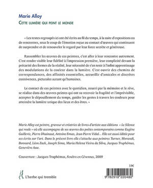 « Les textes regroupés ici ont été écrits au fil du temps, à la suite d'expositions ou de rencontres, sous le coup de l'émotion reçue au contact d'oeuvres qui continuent de surprendre et de renouveler le regard par leur force secrète et généreuse.