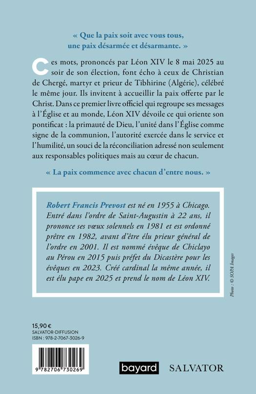 « Que la paix soit avec vous tous, une paix désarmée et désarmante. » Ces mots, prononcés par Léon XIV au soir de son élection le 8 mai 2025, font écho à ceux de Christian de Chergé, martyr et prieur de Tibhirine, célébré le même jour. Ils invitent à accueillir la paix offerte par le Christ. Dans ce premier livre officiel qui regroupe ses messages à l'Église et au monde, Léon XIV dévoile ce qui oriente son pontificat : la primauté de Dieu, l'unité dans l'Église comme signe de la communion, l'autorité exercée dans le service et l'humilité, un souci de la réconciliation adressé non seulement aux responsables politiques mais au cÅur de chacun. « La paix commence avec chacun d'entre nous. »