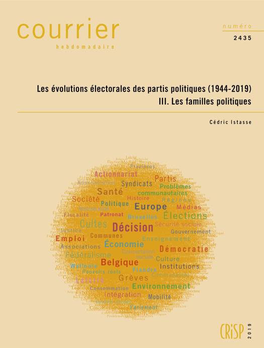 Ce Courrier hebdomadaire se penche sur un aspect particulier de l’histoire des familles politiques : leurs évolutions électorales depuis la fin de la Seconde Guerre mondiale. Le constat qui s’impose est celui d’un déclin global, d’abord somme toute limité jusqu’au début du 21e siècle mais qui s’amplifie et s’accélère depuis une dizaine d’années. En 1958, le score électoral cumulé des familles culminait à 95 %. En 2019, il est d’à peine 57 %. Bien plus, si l’on ne s’intéresse qu’aux trois familles dites traditionnelles (rouge, bleue et orange), le chiffre chute désormais – ce qui constitue un fait sans précédent – sous la barre des 50 %. Cette évolution est particulièrement marquée pour les socialistes en Wallonie, pour les libéraux en Région bruxelloise et pour les sociaux-chrétiens en Flandre. Pour leur part, les écologistes ont connu un mouvement « en dents de scie ».