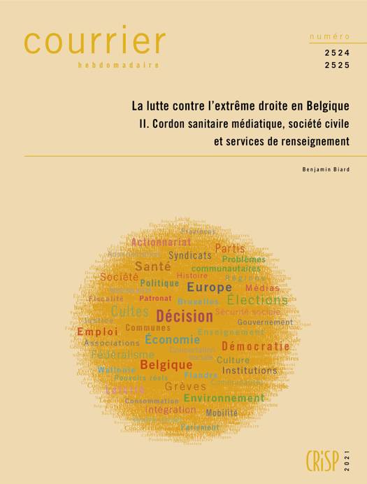 Quels sont les acteurs, les instruments et les stratégies de la lutte contre l’extrême droite en Belgique, et quels semblent être leurs effets ? C’est à cette question, d’une importance certaine mais fort peu explorée par la littérature scientifique, que répond ce Courrier hebdomadaire. La lutte contre l’extrême droite prend des visages multiples. Ses acteurs sont issus de diverses sphères : politique, judiciaire, associative, médiatique, etc. Ses instruments sont hétérogènes : des lois aux campagnes de sensibilisation, en passant par les règlements d’assemblée parlementaire, les accords entre partis politiques, les manifestations ou la confrontation directe. Ses stratégies sont plurielles, qu’elles visent à éviter ou à endiguer la progression des idées d’extrême droite au sein de la société en général, ou à contrer une personne ou association particulière incarnant cette tendance politique. Partant, ses résultats sont difficiles à cerner, si ce n’est d’une manière globale. Ce second tome s’intéresse au « cordon sanitaire médiatique » (dispositif qui n’a cours qu’en Belgique francophone), aux mobilisations de la société civile (dont l’activisme antifasciste) et à la surveillance des groupes et personnes d’extrême droite par les services de renseignement et de sécurité (Sûreté de l’État, SGRS et OCAM).