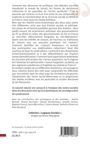 Comment des décennies de néolibéralisme ont-elles transformé le travail, les résistances collectives et l'action syndicale ? Cet ouvrage compare les transformations sociales et politiques au Brésil et en France. Dans quelle mesure les gouvernements du PT au Brésil et du PS en France se sont-ils éloignés du néo-libéralisme ? Quels sont les intérêts de classes que ces pouvoirs ont traduits ? Comment identifier les « classes moyennes » et évaluer leur participation aux mobilisations collectives ? Quel rôle continue de jouer le syndicalisme ? Il s'agit de comprendre les difficultés des formations de gauche : l'épuisement des forces social-démocrates et la progression des droites extrêmes avec la victoire de Jair Bolsonaro au Brésil. Ce second volume analyse les luttes sociales dans les deux pays et les dynamiques de reconfiguration du syndicalisme.