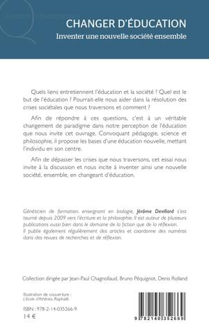 Quels liens entretiennent l'éducation et la société ? Quel est le but de l'éducation ? Pourrait-elle nous aider dans la résolution des crises sociétales que nous traversons et comment ? Afin de répondre à ces questions, c'est à un véritable changement de paradigme dans notre perception de l'éducation que nous invite cet ouvrage. Convoquant pédagogie, science et philosophie, il propose les bases d'une éducation nouvelle, mettant l'individu en son centre. Afin de dépasser les crises que nous traversons, cet essai nous invite à la discussion et nous incite à inventer ainsi une nouvelle société, ensemble, en changeant d'éducation.
