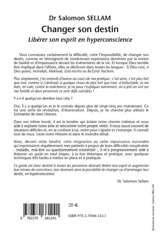 Vous connaissez certainement la difficulté, voire l'impossibilité, de changer son destin, comme en témoignent de nombreuses expressions dominées par la notion de fatalité et d'impuissance devant les événements de la vie. Et lorsque Dieu semble être impliqué dans l'affaire, elles se déclinent dans toutes les langues : Si Dieu veut, si Dios quiere, Inchallah, Mektoub, Está escrito ou Be Ezrat Hachem. Plus simplement, j'en entends d'autres au cours de ma pratique : c'est ainsi, c’est plus fort que moi, comme si j’obéissais à quelque chose de plus fort que tout, d’inéluctable. Je me bats, en vain, contre la malchance. Je ne peux l'expliquer autrement, on a jeté un sort sur ma famille et deux personnes se sont déjà suicidées ! Y a-t-il quelqu'un derrière tout cela ? Oui, il y a quelqu'un et je le connais depuis plus de vingt-cinq ans maintenant. Ce fut une sorte de révélation, d'illumination. Depuis, je ne cherche plus ailleurs le Scénariste de mon Univers. Dans son infinie bonté, il est la lumière qui éclaire notre chemin intérieur et nous aide à explorer notre âme et rencontrer notre propre vérité. Il nous sauve souvent de situations difficiles et, en se confiant à lui, notre peur s'apaise et s’estompe. Il connaît tout de nous, toute notre Histoire et dans le moindre détail. Ainsi, devant cette fatalité, cette résignation ou cette impuissance inexorable qu'exprimaient régulièrement mes patients à propos de leurs difficultés inexplicables - maladie, mal-être ou questionnement existentiel -, il m'a progressivement aidé à élaborer un guide en neuf étapes, à la fois théorique et pratique, avec quelques techniques très faciles à mettre en place et à pratiquer. « Ce guide est donc destiné à toutes les personnes désirant libérer leur esprit et augmenter leur niveau de conscience, leur donnant ainsi la possibilité de changer ou d'aménager leur destin, en hyperconscience ». Dr. Salomon Sellam.
