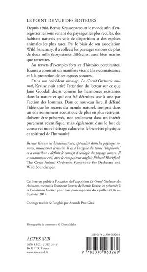 Depuis 1968, Bernie Krause parcourt le monde afin d'enregistrer les sons venant des paysages les plus reculés, des habitats naturels en voie de disparition et des espèces animales les plus rares. Par le biais de son association Wild Sanctuary, il a collecté les paysages sonores de plus de deux mille écosystèmes différents, aussi bien marins que terrestres. Au travers d'exemples forts et d'histoires percutantes, Krause a construit un manifeste visant à la reconnaissance et à la protection de ces espaces sonores. Dans son précédent ouvrage, «Le Grand Orchestre animal», Krause avait attiré l'attention du lecteur sur ce que Jane Goodall décrit comme les harmonies existantes dans la nature et qui ont été détruites une à une par l'action des hommes. Dans ce nouveau livre, il défend l'idée que les secrets du monde naturel, compris dans un environnement acoustique de plus en plus restreint, doivent être préservés, non seulement dans un intérêt purement scientifique, mais également dans le but de conserver notre héritage culturel et le bien-être physique et spirituel de l'humanité.