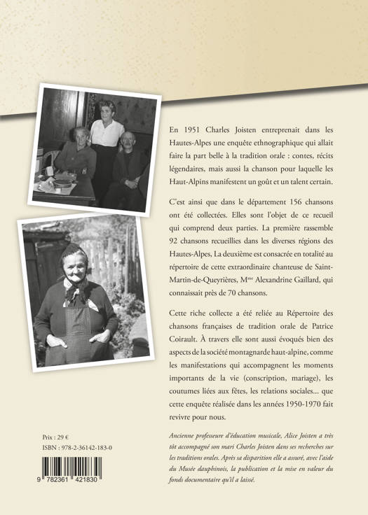 En 1951 Charles Joisten entreprenait dans les Hautes-Alpes une enquête ethnographique qui allait faire la part belle à la tradition orale : contes, récits légendaires, mais aussi la chanson pour laquelle les Haut-Alpins manifestent un goût et un talent certain. C’est ainsi que dans le département 156Â chansons ont été collectées. Elles sont l’objet de ce recueil qui comprend deux parties. La première rassemble 92Â chansons recueillies dans les diverses régions des Hautes-Alpes, La deuxième est consacrée en totalité au répertoire de cette extraordinaire chanteuse de Saint-Martin-de-Queyrières, Mme Alexandrine Gaillard, qui connaissait près de 70Â chansons. Cette riche collecte a été reliée au Répertoire des chansons françaises de tradition orale de Patrice Coirault. À travers elle sont aussi évoqués bien des aspects de la société montagnarde haut-alpine, comme les manifestations qui accompagnent les moments importants de la vie (conscription, mariage), les coutumes liées aux fêtes, les relations sociales... que cette enquête réalisée dans les années 1950-1970 fait revivre pour nous. Ancienne professeure d’éducation musicale, Alice Joisten a très tôt accompagné son mari Charles Joisten dans ses recherches sur les traditions orales. Après sa disparition elle a assuré, avec l’aide du Musée dauphinois, la publication et la mise en valeur du fonds documentaire qu’il a laissé.