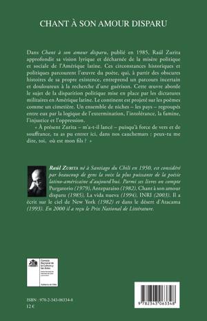 Raúl Zurita approfondit dans ce recueil sa vision lyrique et décharnée de la misère politique et sociale de l'Amérique latine. Ces circonstances historiques et politiques parcourent l'oeuvre du poète, qui, à partir des obscures histoires de sa propre existence, entreprend un parcours incertain et douloureux à la recherche d'une guérison. Cette oeuvre aborde le sujet de la disparition politique mise en place par les dictatures militaires en Amérique latine.