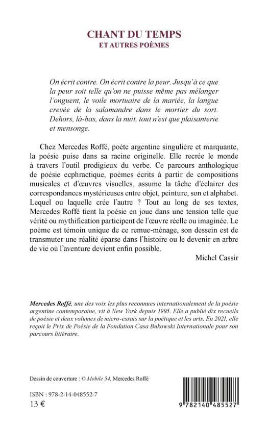 On écrit contre. On écrit contre la peur. Jusqu'à ce que la peur soit telle qu'on ne puisse même pas mélanger l'onguent, le voile mortuaire de la mariée, la langue crevée de la salamandre dans le mortier du sort. Dehors, là-bas, dans la nuit, tout n'est que plaisanterie et mensonge. Chez Mercedes Roffé, poète argentine singulière et marquante, la poésie puise dans sa racine originelle. Elle recrée le monde à travers l'outil prodigieux du verbe. Ce parcours anthologique de poésie ecphractique, poèmes écrits à partir de compositions musicales et d'oeuvres visuelles, assume la tâche d'éclairer des correspondances mystérieuses entre objet, peinture, son et alphabet. Lequel ou laquelle crée l'autre ? Tout au long de ses textes, Mercedes Roffé tient la poésie en joue dans une tension telle que vérité ou mythification participent de l'oeuvre réelle ou imaginée. Le poème est témoin unique de ce remue-ménage, son dessein est de transmuter une réalité éparse dans l'histoire ou le devenir en arbre de vie où l'aventure devient enfin possible. Michel Cassir
