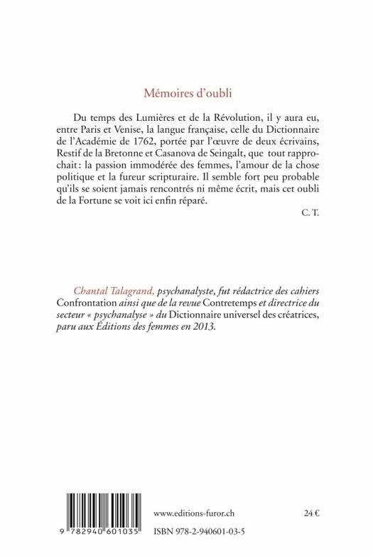 Du temps des Lumières et de la Révolution, il y aura eu, entre Paris et Venise, la langue française, celle du Dictionnaire de l’Académie de 1762, portée par l’œuvre de deux écrivains, Restif de la Bretonne et Casanova de Seingalt, que tout rapprochait : la passion immodérée des femmes, l’amour de la chose politique et la fureur scripturaire. Il semble fort peu probable qu’ils se soient jamais rencontrés ni même écrit, mais cet oubli de la Fortune se voit ici enfin réparé.