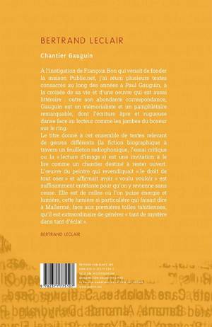 A l’instigation de Franc ois Bon qui venait de fonder la maison Publie.net, j’ai re uni plusieurs textes consacre s au long des anne es a Paul Gauguin, a la croise e de sa vie et d’une œuvre qui est aussi litte raire : outre son abondante correspondance, Gauguin est un me morialiste et un pamphle taire remarquable, dont l’e criture a pre et rugueuse danse face au lecteur comme les jambes du boxeur sur le ring.