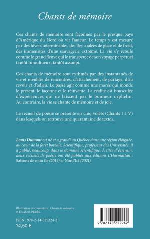 Ces chants de mémoire sont façonnés par le presque pays d’Amérique du Nord où vit l’auteur. Le temps y est mesuré par des hivers interminables, des îles coulées de glace et de froid, des immensités d’une sauvagerie extrême. La vie s’y écoule comme le grand fleuve qui le transperce de son voyage perpétuel tantôt tumultueux, tantôt assoupi. Ces chants de mémoire sont rythmés par des instantanés de vie et meublés de rencontres, d’attachement, de partage, d’au revoir et d’adieu. Le passé agit comme une marée qui inonde le présent, le façonne et le réinvente. La réalité est bousculée d’expériences qui ne laissent pas le bonheur orphelin. Au contraire, la vie se chante de mémoire et de joie. Le recueil de poésie se présente en cinq volets (Chants I à V) dans lesquels on retrouve une quarantaine de textes.