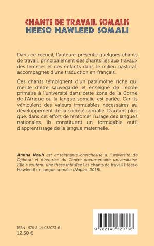 Dans ce recueil, l'auteure présente quelques chants de travail, principalement des chants liés aux travaux des femmes et des enfants dans le milieu pastoral, accompagnés d'une traduction en français. Ces chants témoignent d'un patrimoine riche qui mérite d'être sauvegardé et enseigné de l'école primaire à l'université dans cette zone de la Corne de l'Afrique où la langue somalie est parlée. Car ils véhiculent des valeurs immuables nécessaires au développement de la société somalie. D'autant plus que, dans cet effort de renforcer l'usage des langues nationales, ils constituent un formidable outil d'apprentissage de la langue maternelle.