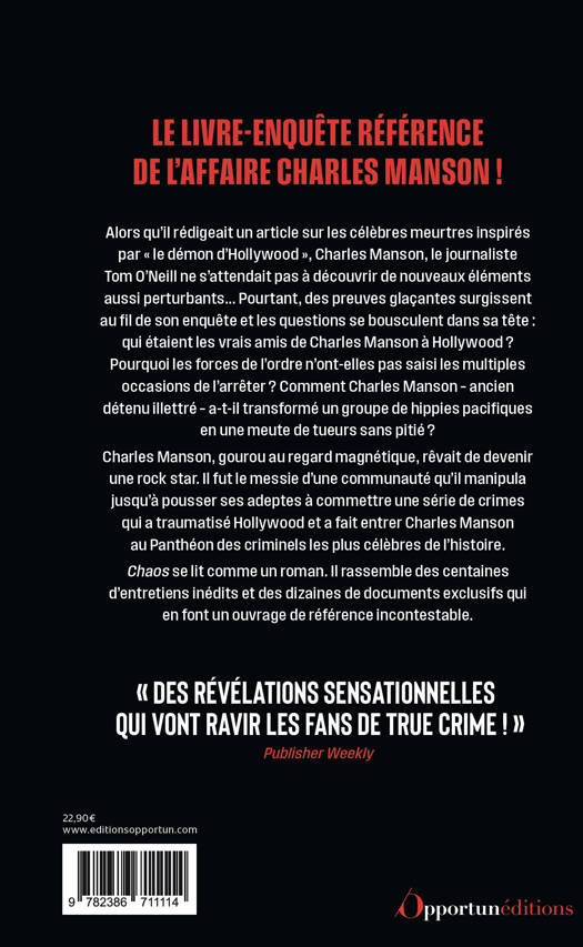 Charles Manson, gourou au regard magnétique, rêvait de devenir une rock star. Il fut le messie d’une communauté qu’il manipula jusqu’à pousser ses adeptes à commettre une série de crimes qui a traumatisé Hollywood et a fait entrer Charles Manson au Panthéon des criminels les plus célèbres de l’histoire. Chaos se lit comme un roman. Il rassemble des centaines d’entretiens inédits et des dizaines de documents exclusifs qui en font un ouvrage de référence incontestable.
