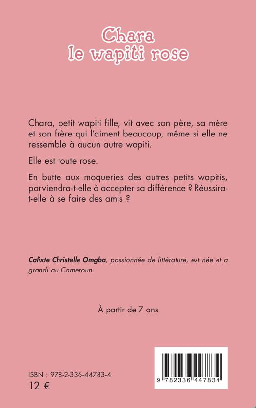 Chara, petit wapiti fille, vit avec son père, sa mère et son frère qui l’aiment beaucoup, même si elle ne ressemble à aucun autre wapiti. Elle est toute rose. En butte aux moqueries des autres petits wapitis, parviendra-t-elle à accepter sa différence ? Réussira-t-elle à se faire des amis ? À partir de 7 ans