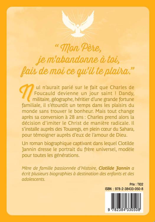 D'un caractère passionné et rebelle, Charles de Foucauld chercha d'abord le bonheur dans les plaisirs du monde. Il rencontra finalement le Christ de manière fulgurante un matin d'octobre à Paris. Cherchant à imiter le Christ de manière radicale, il s’installa au cœur du Sahara, témoignant de l'amour de Dieu par son attention à chacun. Il y offrit sa vie en 1916, ayant choisi de rester auprès des Touaregs malgré la guerre. Dans cette biographie qui se lit comme un roman, Clotilde Jannin propose aux jeunes une véritable rencontre avec ce saint si passionné de Dieu.