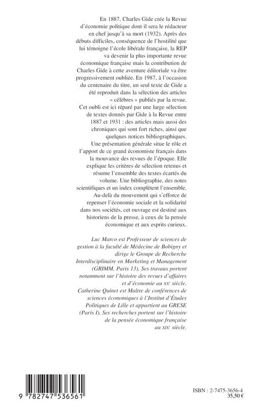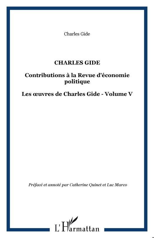 En 1887, Charles Gide créé la Revue d'économie politique dont il sera le rédacteur en chef jusqu'à sa mort (1932). Cet ouvrage propose une large sélection de textes donnés par Gide à la Revue entre 1887 et 1931. Une présentation générale situe le rôle et l'apport de ce grand économiste français qui s'efforce de repenser l'économie sociale et la solidarité dans nos sociétés.