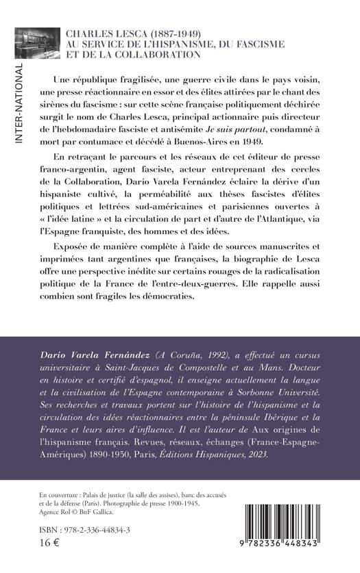 Une république fragilisée, une guerre civile dans le pays voisin, une presse réactionnaire en essor et des élites attirées par le chant des sirènes du fascisme sur cette scène française politiquement déchirée surgit le nom de Charles Lesca, principal actionnaire puis directeur de l'hebdomadaire fasciste et antisémite Je suis partout, condamné à mort par contumace et décédé à Buenos-Aires en 1949. En retraçant le parcours et les réseaux de cet éditeur de presse franco-argentin, agent fasciste, acteur entreprenant des cercles de la Collaboration, Darío Varela Fernández éclaire la dérive d'un hispaniste cultivé, la perméabilité aux thèses fascistes d'élites politiques et lettrées sud-américaines et parisiennes ouvertes à l'idée latine et la circulation de part et d'autre de l'Atlantique, via l'Espagne franquiste, des hommes et des idées. Exposée de manière complète à l'aide de sources manuscrites et imprimées tant argentines que françaises, la biographie de Lesca offre une perspective inédite sur certains rouages de la radicalisation politique de la France de l'entre-deux-guerres. Elle rappelle aussi combien sont fragiles les démocraties.