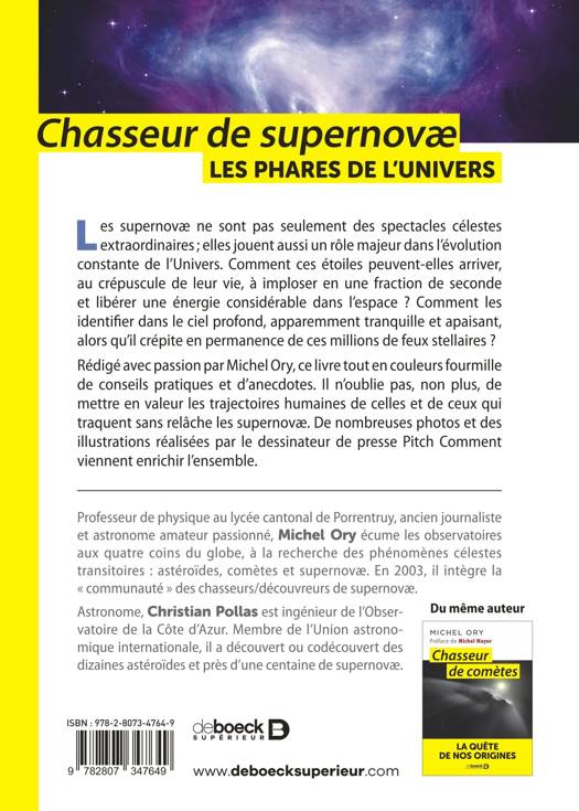 Rédigé avec passion par Michel Ory, ce livre tout en couleurs fourmille de conseils pratiques et d’anecdotes. Il n’oublie pas, non plus, de mettre en valeur les trajectoires humaines de celles et de ceux qui traquent sans relâche les supernovæ. De nombreuses photos et des illustrations réalisées par le dessinateur de presse Pitch Comment viennent enrichir l’ensemble.