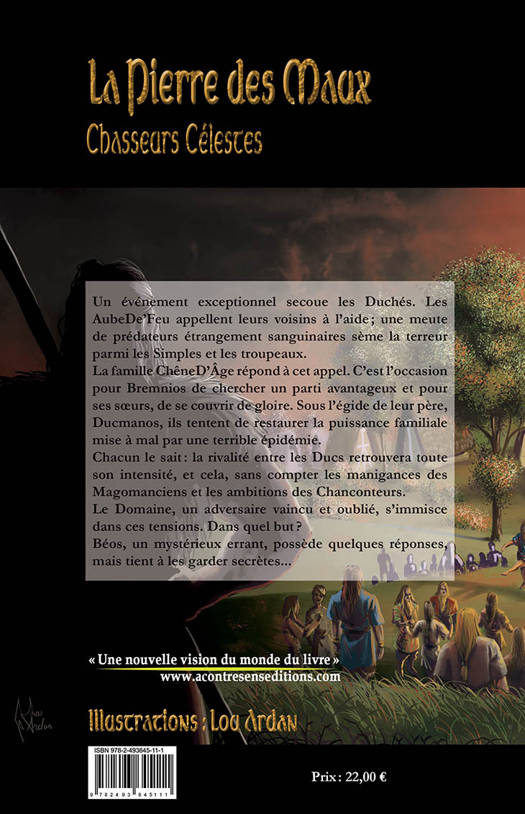 Argumentaire : Depuis sa création, la Fantasy s’inspire de notre Histoire pour nous offrir des récits de vastes mondes imaginaires qui, pourtant, font tant écho au nôtre. La Pierre des Maux ne fait pas exception et c’est grâce à deux événements majeurs de notre histoire européenne qu’elle comble notre soif d’aventure et de quête de sens : la Guerre des Gaules et l’apparition de la Peste Noire en Europe. Le prologue donne le ton. Intense et haletant, il nous plonge dans un univers subtilement travaillé, à découvrir au fil des pages, dans un savant équilibre de révélations et d’intrigues. Les personnages évoluent dans une société complexe et spirituelle qui ne décevra pas les amateurs du genre. Les illustrations de Lou Ardan apportent une intensité supplémentaire à cette saga très prometteuse. Résumé : Un événement exceptionnel secoue les Duchés. Les AubeDe’Feu appellent leurs voisins à l’aide ; une meute de prédateurs étrangement sanguinaires sème la terreur parmi les Simples et les troupeaux. La famille ChêneD’Âge répond à cet appel. C’est l’occasion pour Bremnios de chercher un parti avantageux et pour ses sœurs, de se couvrir de gloire. Sous l’égide de leur père, Ducmanos, ils tentent de restaurer la puissance familiale mise à mal par une terrible épidémie. Chacun le sait : la rivalité entre les Ducs retrouvera toute son intensité, et cela, sans compter les manigances des Magomanciens et les ambitions des Chanconteurs. Le Domaine, un adversaire vaincu et oublié, s’immisce dans ces tensions. Dans quel but ? Béos, un mystérieux errant, possède quelques réponses, mais tient à les garder secrètes.
