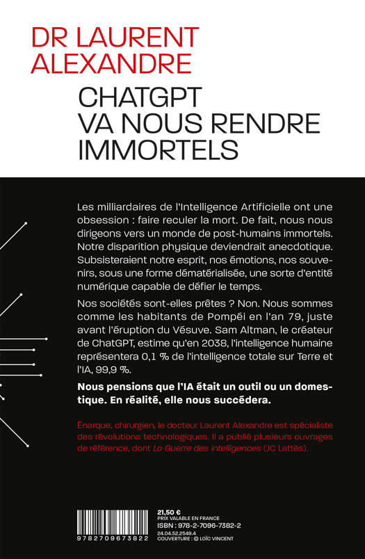 Les milliardaires de l’Intelligence Artificielle ont une obsession : faire reculer la mort. De fait, nous nous dirigeons vers un monde de post-humains immortels. Notre disparition physique deviendrait anecdotique. Subsisteraient notre esprit, nos émotions, nos souvenirs, sous une forme dématérialisée, une sorte d’entité numérique capable de défier le temps. Nos sociétés sont-elles prêtes ? Non. Nous sommes comme les habitants de Pompéi en l’an 79, juste avant l’éruption du Vésuve. Sam Altman, le créateur de ChatGPT, estime qu’en 2038, l’intelligence humaine représentera 0,1 % de l’intelligence totale sur Terre et l’IA, 99,9 %.