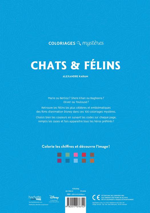 Marie ou Berlioz ? Shere Khan ou Bagheera ? Olivier ou Toulouse ? Retrouve les félins les plus célèbres et emblématiques des films d'animation Disney dans ces 100 coloriages mystères. Choisis bien tes couleurs en suivant les codes sur chaque page, remplis les cases et fais apparaître tous tes héros préférés !
