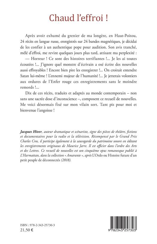 Après avoir exhumé du grenier de ma longère, en Haut-Poitou, 24 récits en langue russe, enregistrés sur 24 bandes magnétiques, je décidai de les confier à un authentique pope pour audition. Son avis tranché, mêlé d'effroi, me revint quelques jours plus tard, attisant ma perplexité : — Horreur ! Ce sont des histoires terrifiantes !... Je les ai toutes écoutées !... J'ignore quel monstre d'écrivain a osé écrire des nouvelles aussi effroyables ! Encore bien pire les enregistrer !... On croirait entendre Satan lui-même ! L'ennemi majeur de l'humanité !... Je jetterais volontiers aux ordures de l'Enfer rouge ces enregistrements sans le moindre remords !... Dix de ces récits, traduits et adaptés au monde contemporain – non sans une sacrée dose d'inconscience –, composent ce recueil de nouvelles. Me voici désormais fixé sur mon vilain sort. Tant pis pour moi et bienvenue l'angoisse !