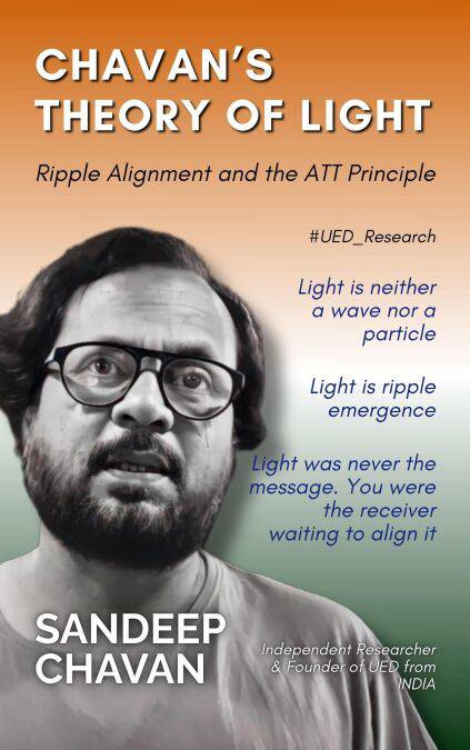 Chavan's Theory of Light: Ripple Alignment and the ATT Principle introduces a radical shift in our understanding of one of the most fundamental phenomena in science—light. In this groundbreaking work, independent researcher and theorist Sandeep J. Chavan dismantles centuries-old assumptions about light as a wave or particle, offering instead a bold and elegant alternative grounded in his original framework: Universal Energy Dynamics (UED).