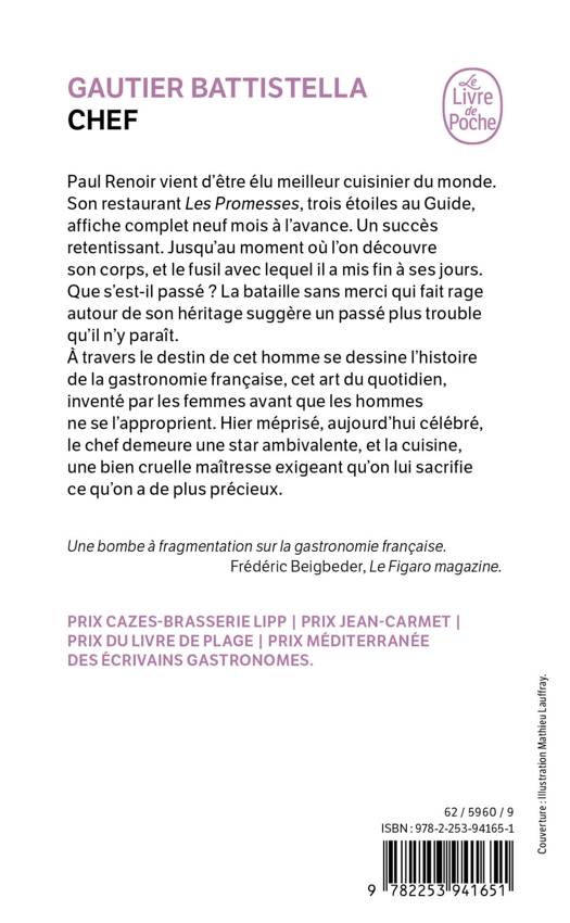 Paul Renoir vient d’être élu meilleur cuisinier du monde. Son restaurant Les Promesses, trois étoiles au Guide, affiche complet neuf mois à l’avance. Un succès retentissant. Jusqu’à ce que l’on découvre son corps, et le fusil avec lequel il a mis fin à ses jours. Que s’est-il passé ? La bataille sans merci qui fait rage autour de son héritage suggère un passé plus trouble qu’il n’y paraît. A travers le destin de Paul Renoir se dessine l’histoire de la cuisine française, cet art du quotidien, inventé par les femmes avant que les hommes ne se l’approprient. Hier méprisé, aujourd’hui célébré, le chef demeure une star ambivalente, et la cuisine, une bien cruelle maîtresse qui exige qu’on lui sacrifie ce qu’on a de plus précieux.