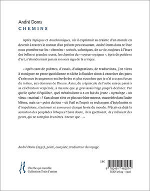 Après Topiques et Anachroniques, où il exprimait sa crainte d’un monde en devenir à travers le constat d’un présent peu rassurant, André Doms dans ce livre nous promène sur les « chemins » ravinés, cahotiques, de sa vie, toujours à l’écart des belles et grandes routes, les chemins du « voyeur voyageur », épris de poésie et d’art, n’abandonnant jamais son sens aigu de la critique.