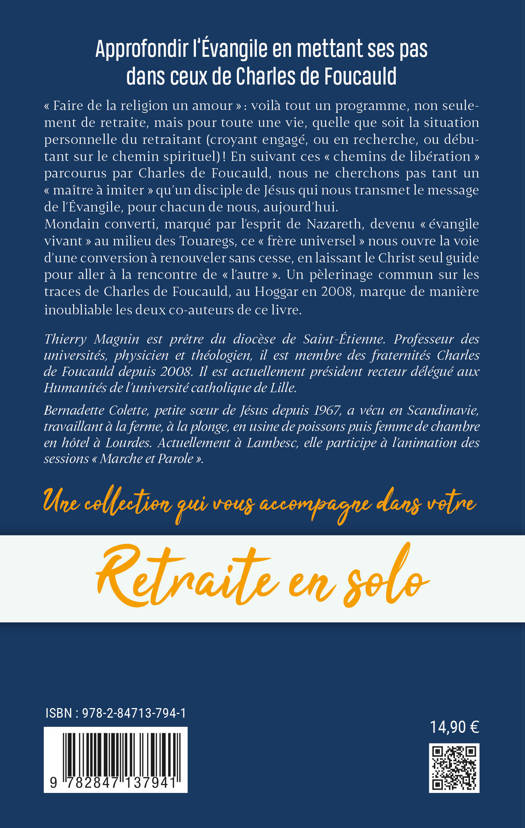 Retraite guidée par celui « qui a fait de la religion un amour », prenant pour cela le risque de la foi et de la conversion. Voilà tout un programme, non seulement de retraite, mais pour toute une vie, quelle que soit la situation personnelle du retraitant (croyant engagé, ou en recherche, ou débutant sur le chemin spirituel) ! La figure de Charles, « frère universel », mondain converti, marqué par l’esprit de Nazareth, devenu « évangile vivant » au milieu des Touaregs, est d’une grande actualité pour l’Église et le monde d’aujourd’hui. 7 jours de retraite pour explorer 7 étapes de la vie de ce nouveau saint, comme autant de chemins de vie et de foi.
