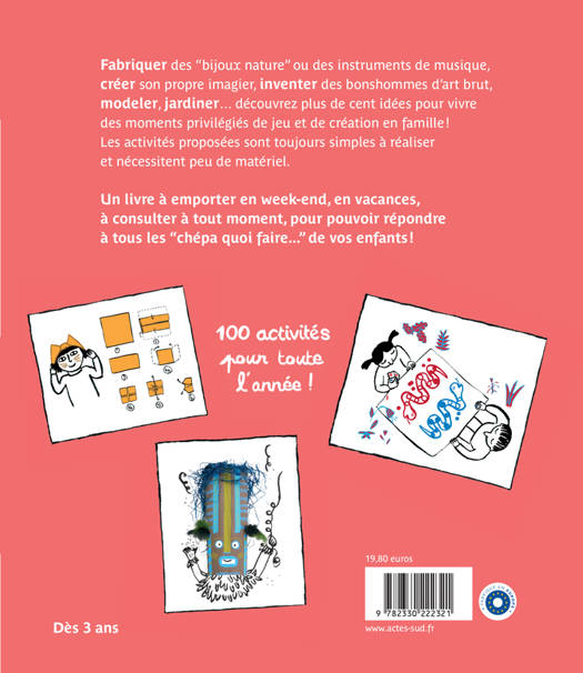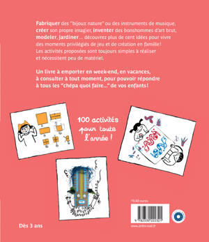 Fabriquer des « bijoux nature », créer son propre imagier, inventer des bonshommes d'art brut, modeler, jardiner ou apprendre à faire des ombres... Vous trouverez dans cet ouvrage plus de cent idées pour vivre des moments privilégiés de jeu et de création en famille. Organisé autour des saisons, ce livre s'utilise mois par mois, comme un agenda. Il suit le calendrier scolaire et le quotidien des petits. Les activités proposées sont adaptées aux 3-6 ans. Elles sont toujours simples à réaliser et nécessitent peu de matériel. Un livre à emporter en week-end, en vacances, à consulter à tout moment, pour pouvoir répondre à tous les « chépa quoi faire... » de vos enfants !
