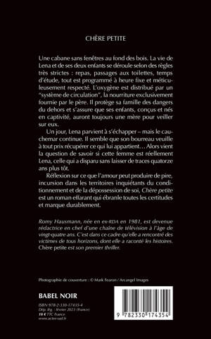 Une cabane sans fenêtres au fond des bois. La vie de Lena et de ses deux enfants se déroule selon des règles très strictes : repas, passages aux toilettes, temps d'étude, tout est programmé à heure fixe et méticuleusement respecté. L'oxygène est distribué par un "système de circulation", la nourriture exclusivement fournie par le père. Il protège sa famille des dangers du dehors et s'assure que ses enfants, conçus et nés en captivité, auront toujours une mère pour veiller sur eux. Un jour, Lena parvient à s'échapper - mais le cauchemar continue. Il semble que son bourreau veuille à tout prix récupérer ce qui lui appartient... Alors vient la question de savoir si cette femme est réellement Lena, celle qui a disparu sans laisser de traces quatorze ans plus tôt. Réflexion sur ce que l'amour peut produire de pire, incursion dans les territoires inquiétants du conditionnement et de la dépossession de soi, "Chère petite" est un roman effarant qui ébranle toutes les certitudes et marque durablement.