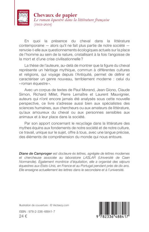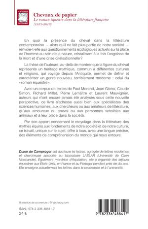 En quoi la présence du cheval dans la littérature contemporaine - alors qu'il ne fait plus partie de notre société - renvoie-t-elle aux questionnements écologiques actuels sur la place de l'homme au sein de la nature, cristallisant à la fois l'angoisse de la mort et d'une crise civilisationnelle ? La thèse de l'auteure, au-delà de montrer que la figure du cheval représente un héritage mythique, commun à différentes cultures et religions, qui voyage depuis l'Antiquité, permet de définir et caractériser un genre nouveau, terriblement moderne celui du roman équestre . Avec un corpus de textes de Paul Morand, Jean Giono, Claude Simon, Richard Millet, Pierre Lemaître et Laurent Mauvignier, auteurs qui n'ont encore jamais été analysés sous cette nouvelle perspective, ce livre s'adresse aussi bien aux spécialistes des sciences humaines, aux chercheurs ou aux amateurs de littérature, qu'aux amoureux du cheval ou aux personnes sensibles aux animaux et à leur place dans la société. Par son apport concernant le recyclage dans la littérature des mythes équins aux fondements de notre société et de notre culture, ce travail, unique sur le sujet, offre à tous, avec une langue précise, des éléments de compréhension du monde qui nous entoure.