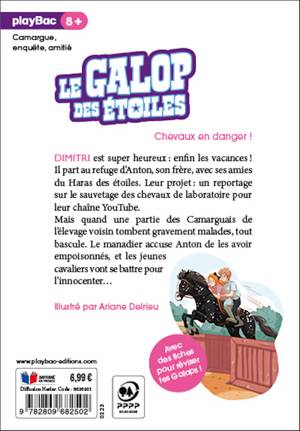 Dimitri est super heureux : enfin les vacances ! Il part au refuge d’Anton, son frère, avec ses amies du Haras des étoiles. Leur projet : un reportage sur le sauvetage des chevaux de laboratoire pour leur chaîne YouTube. Mais quand une partie des Camarguais de l’élevage voisin tombent gravement malades, tout bascule. Le manadier accuse Anton de les avoir empoisonnés, et les jeunes cavaliers vont se battre pour l’innocenter…