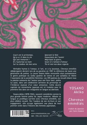 Court est le printemps, Qu'y a-t-il dans la vie Qui soit immortel? Et j'autorisai sa main Sur la rondeur de mes seins Ignorant la Voie Insouciants de l'avenir Meprisant la gloire, Seuls ici s'aimant d'amour Toi et moi nos deux regards Veritable hymne a l'amour, a l'art, et a la jeunesse, Cheveux emmeles (Midaregami) devient lors de sa parution en 1901 la reference de toute une generation de poetes. La jeune Yosano Akiko renouvelle alors puissamment le genre poetique du tanka (poeme de trente et une syllabes) et libere l'expression de la sensibilite feminine. Les 399 poemes du recueil disent tous la passion naissante de l'auteur pour son futur mari, poete lui aussi, dans une celebration aerienne du printemps et l'evidence joyeuse d'un coeur amoureux. Cette oeuvre capitale du romantisme japonais est ici traduite pour la premiere fois dans son integralite en langue occidentale.